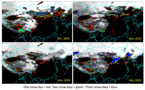 Filtering of snow cover: The high visible wavelength reflectivity of snow increased the brightness of lighting observed by satellite. Figure 3 shows an example of snow–induced brightening along a transect through Harbin, China, where snow was absent in December 2018 but consistently present during the December 2019 compositing period. The December 2018 radiance was consistently dimmer than the December 2019 levels. At present, there is no technique for removing snow effects. Therefore, grid cells having snow cover in any of the four months were excluded from the change detection analysis. A snow cover mask was produced for each of the four months using NOAA Advanced Microwave Sounding Unit-A (AMSU-A) daily snow cover product [14], tallying the number of times snow cover was detected for the same set of days used in the DNB cloud-free composites (Figure 4). Monthly snow cover tallies of one and two were filtered out to remove false detections. This removed a narrow rim of AMSU-A detections surrounding the consistently snow-covered areas. Then, the four monthly snow products were added together to generate a mask used to zero out lighting affected by snow cover in any of the four months.