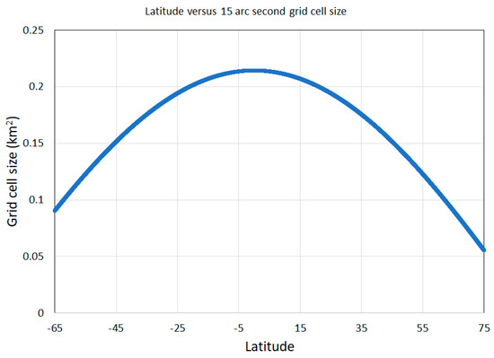 Dependence of grid cell size on latitude. Ground footprint sizes for 15 arc-second grid cells were largest at the equator and declined moving in either direction away from the equator.