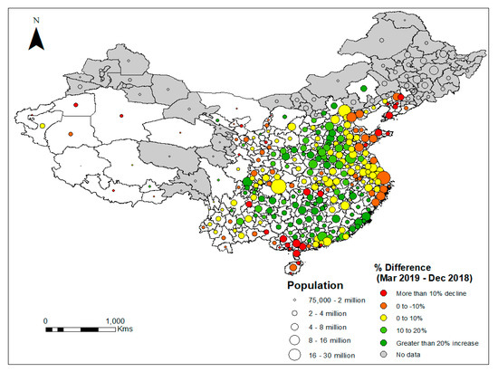 Map of the % changes in brightness for the reference period (brightness in December 2018 minus brightness in March 2019). The administrative unit boundaries are shown in black, and population size classes of each are indicated with circles with five diameters placed at the administrative unit’s centroid. Administrative units, where lighting was completely masked out, are gray. There were three classes for increased brightness in March 2019, indicated by yellow, light green, and dark green. The orange and red classes indicated declines in brightness in February 2020. Yellow and green classes predominated in the central core of China’s densely populated heartland. (The tabular data used to generate the maps see Supplementary Materials).