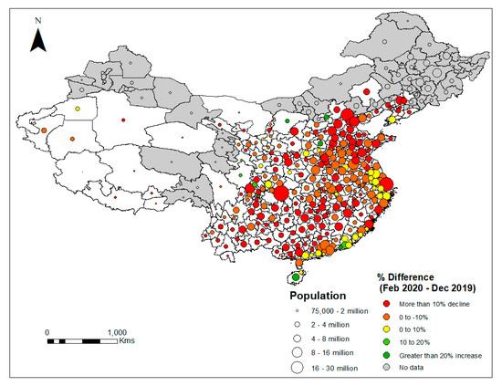 The monthly composites include a pair of images—the average radiance and the tally of cloud-free coverages. Radiance difference images were calculated and used to produce colorized maps for specific cities. In addition, we calculated the percentage change in brightness for more than 300 level 2 administrative units [12]. The grid cell set used for the four months in the % change calculation was standardized by blocking grid cells having low cloud-free coverages or extremely low radiances. Then, the radiances were summed for each administrative unit. These sums were then differenced, and a percent difference was calculated.