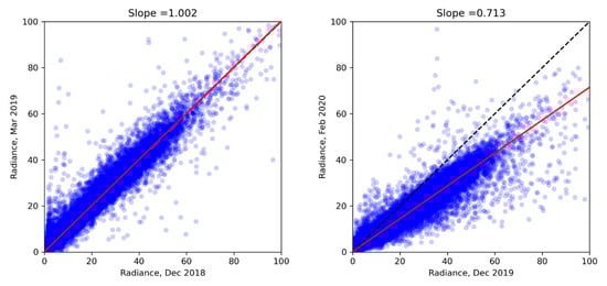 Radiance scattergrams offer another way to visualize the dimming. In the reference set, the scattergram data cloud was aligned with the diagonal, indicating no systematic dimming or brightening between the two months of the reference set. In contrast, the scattergram of the pandemic set shows the entire data cloud shifted to lower radiance levels in February 2020 relative to in December 2019.