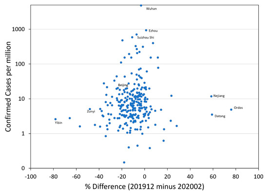 Correlation with confirmed cases: The percent change in SOL from the pandemic monthly pair was matched to the number of confirmed COVD-19 cases per million people from January 15 to the end of February 2020 [13]. The results (Figure 11) indicated that dimming occurred in many cities with few confirmed cases.