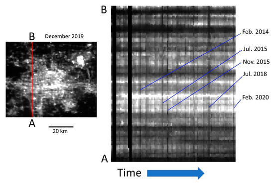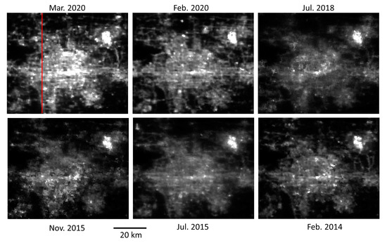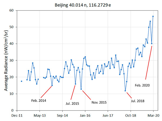 Is the February 2020 dimming unique? To examine whether the February 2020 dimming is unique, we constructed a data cube with 96 monthly cloud-free composites of Beijing, spanning from April 2012 to March 2020. In examining the monthly temporal profiles for individual grid cells, it was possible to see a radiance dip in February 2020 relative to those in the previous two months and March 2020 (Figure 12). However, there were other dips along the profiles in magnitude comparable to that in February 2020. To determine if the additional dimming events were isolated geographically or spatially extensive, we constructed a temporal slice along a north-south transect across the data cube (Figure 13). Spatially extensive dimming showed up as dark vertical lines. There were two black vertical lines during the early part of the record and three month-wide data gaps centered on the summer solstice caused by the exclusion of stray light contamination prior to the advent of the “stray light correction” [17]. However, there were additional dark vertical lines indicating widescale dimming of lights. Regardless of where the transect was taken, the same set of months appeared as dark vertical lines. The most prominent of these were February 2014, July and November 2015, July 2018, and February 2020. December 2019 was bright with sharply defined features (Figure 14). To investigate the cause of the dimming, average radiance images in each of these months were compared to that in December 2019 (Figure 14). The December 2019 contrast enhancement was applied to each of the other monthly images. It can be seen that December 2019 has the brightest features and the details were sharp. The February 2020 geographic feature details were comparable to those in December 2019, but the radiance levels were dimmed. The other months exhibited dimming with the blurring of spatial details. The examination of the cloud-free coverages revealed that the pre-pandemic dimmed months were short with cloud-free coverages and had multiple data gaps with zero cloud-free coverages (Figure 15).