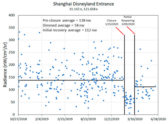 With nightly DNB radiance profiles, it is possible to identify the start dates of dimming and recovery, plus the recovery level relative to the pre-pandemic condition. This was demonstrated for the grid cell containing the Shanghai Disneyland entrance. This site was chosen, because it is one of a few facilities having precise closure and partial reopening dates published. The dimming and onset dates of recovery observed by VIIRS exactly matched the closure and reopening dates. The level of lighting recovery following the reopening was 81% of the pre-pandemic lighting level.