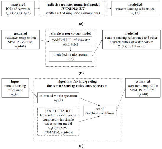 Diagrams illustrating the main modelling and computational approaches used in this paper: (a) Modelling remote-sensing reflectance spectra Rrs(λ) with the Hydrolight model; (b) Modelling spectra of the u ratio and the remote-sensing reflectance (u(λ), Rrs(λ)) and determining the membership in a Forel-Ule class (FU index) using the simple water colour model; (c) Estimating the seawater composition by comparing the input Rrs spectrum with simplified modelling results set out in an extensive lookup table.