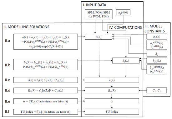 The main equations or sets of model formulas are presented in the form of six blocks in Section II of Figure 2. The first four blocks explicitly state equations with which the spectra of the following quantities can be calculated: total absorption and backscattering coefficients a(λ) and bb(λ), the u(λ) ratio, and the remote-sensing reflectance Rrs(λ) (blocks II.a—II.d). Owing to the complexity of the equations, the next two blocks only symbolically represent sets of formulas for calculating the hue angle α, which characterises the water colour visible to the human eye and the relevant FU index (blocks II.e and II.f, for further details, see Table 1).