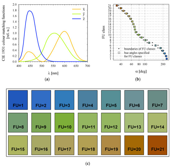 (a) Sensitivity of the human eye as described by spectral functions known as “CIE 1931 colour matching functions” (defined by Commission Internationale de l’Eclairage [43]); (b) diagram illustrating the correspondence between ranges of the hue angle α and the Forel-Ule scale classes (index FU) (acc. to [3]); (c) examples of colours that may represent the Forel-Ule scale classes (acc. to [3]).