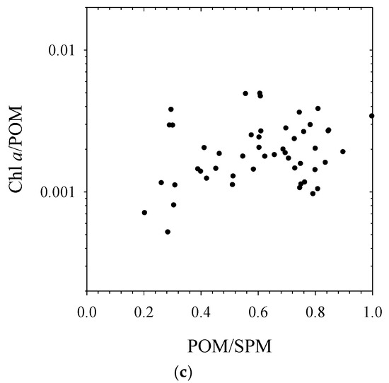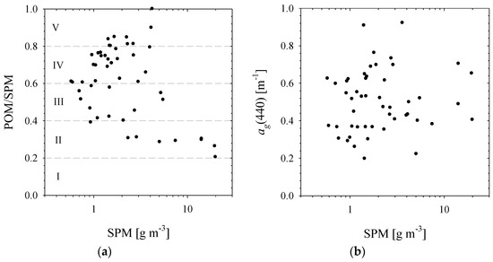 Relationships between quantities characterising the biogeochemical composition of seawater samples from the nearshore environment in the Baltic Sea (the Sopot pier): (a) Ratio of POM/SPM (“composition ratio”) vs. SPM concentration; the horizontal dashed lines represent the proposed division of all cases into five classes (I–V); (b) Variability of ag(440) (absorption coefficient of CDOM at 440 nm) vs. SPM concentration; (c) Ratio of Chla/POM to POM/SPM.