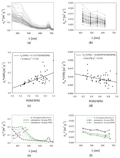 The spectral values of the specific optical coefficients determined in this way are plotted in Figure 5e,f. With such spectra we can write approximate formulas for estimating coefficients ap(λ) and bbp(λ) as functions of given POM and PIM concentrations, as shown on the block diagram of the model in Figure 2 (see blocks II.a and II.b). Figure 5e,f additionally illustrate the average values of ap*(λ) and bbp*(λ) calculated for the proposed groups of particulate matter composition from II to V (characterised by different POM/SPM ranges). The values obtained for these four groups, especially for the light absorption coefficient, highlight the diversity of optical properties associated with the change in proportion between the organic and inorganic fractions in the total mass of particles.