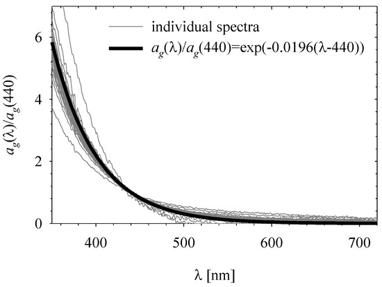 Individual spectra of the normalised CDOM absorption coefficient (values normalised to 440 nm, ag(λ)/ag(440)) for samples from the nearshore environment at Sopot, and the function by which these spectra can be approximated.