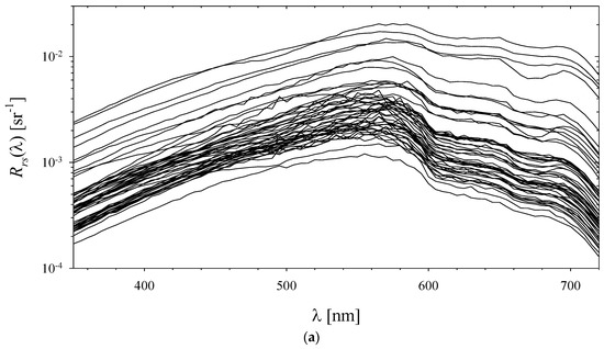 In this paper, we focus on analysing potential relationships between certain biogeochemical characteristics of the seawater composition and the characteristics of its colour that can be observed remotely. One of the major parameters used in remote sensing research is the remote-sensing reflectance Rrs(λ). It is a quantity formally based on the apparent optical properties of seawater (AOPs), i.e., quantities that theoretically depend not only on the composition of seawater, but also on the lighting conditions in the atmosphere. According to the definition (see, e.g., [34]), Rrs(λ) represents the ratio of water-leaving radiance measured just above the sea surface Lw(0+,λ) to the downward irradiance Ed(0+,λ), also measured just above the sea surface. Moreover, Rrs(λ) accurately describes both the intensity of light leaving the water that can be observed under given external lighting conditions, and clearly determines what we intuitively understand by the term “water colour”. It is also known that, to a first approximation, the spectral variability of Rrs is well described by the ratio of the light backscattering coefficient to the sum of the light absorption and backscattering coefficients in water (bb(λ)/[a(λ) + bb(λ)]), denoted by u(λ) (the “u ratio”) (see e.g., [34,35,36]). Later in this work, we are using such approximate relationship between Rrs(λ) and u(λ).