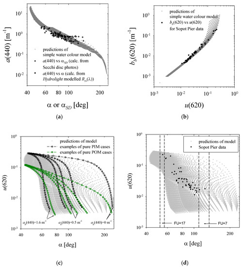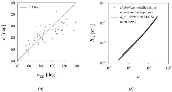 (a) Estimated spectra of the remote-sensing reflectance Rrs for all the water samples from the nearshore environment at Sopot. These spectra were modelled on the basis of measured water IOPs using the full version of the Hydrolight radiative transfer model; (b) Comparison of hue angles calculated from photographs of a submerged Secchi disc (αSD), and calculated from modelled spectra of Rrs (α); (c) Approximate relationship between the remote-sensing reflectance Rrs and the u ratio calculated from the available data.