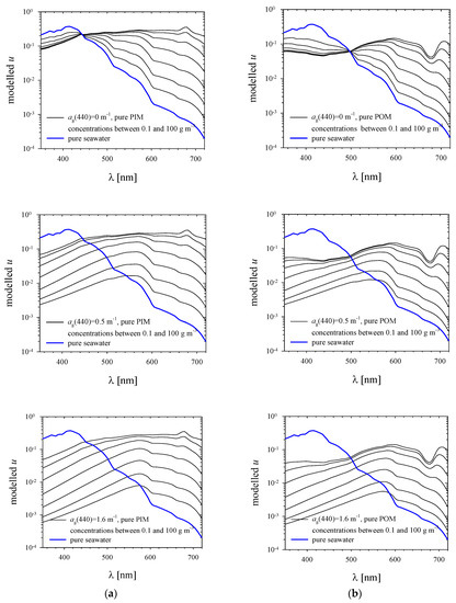 Some examples of the modelled u ratio spectra are shown in Figure 8. These spectra represent only extreme cases of suspended matter composition, i.e., for pure POM in water (POM/SPM = 1) (right-hand panels) or only pure PIM (POM/SPM = 0) (left-hand panels). For clarity, only seven possible POM or PIM concentrations, from 0.1 to 100 g m−3, are shown in each panel, and only three examples of constant CDOM concentrations are considered. The upper panels correspond to the hypothetical complete lack of CDOM in water (ag(440) = 0 m−1), the middle panels are plotted for ag(440) = 0.5 m−1, which is close to the average recorded from the Sopot pier, and the lower panels are plotted for ag(440) = 1.6 m−1, which illustrate conditions typical of the waters of the Vistula, the main river flowing into the Gulf of Gdańsk. Among other things, the curves in this graph visualise the evident impact of variable POM or PIM concentrations on calculated u ratios in the red light range, and also the evident modification of the spectral shapes due to the presence of CDOM in the water, especially in the blue light range.
