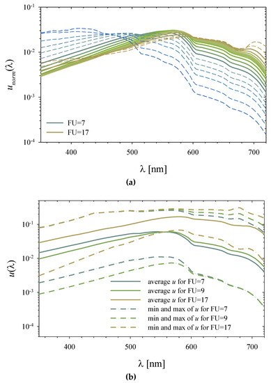 Associated hypothetical remote-sensing reflectance spectra Rrs (λ) were also calculated for all the modelled u ratio spectra (in accordance with block II.d in Figure 2), being subsequently used to determine the hue angle α and FU index. Figure 9a shows the average spectra of normalised u ratios for each class on the Forel-Ule scale. Normalisation was achieved by dividing the u ratios at the individual wavelengths by the integral representing the entire area under the u(λ) curve in the 350–720 nm range. When drawing the individual curves, different colours stood for the various classes (the same colours as in Figure 3c). Classes that appeared as a result of calculations using the full version of Hydrolight for the measured IOPs (i.e., classes from 7 to 17) have been highlighted. By using the simple water colour model for the assumed various hypothetical concentrations of POM, PIM and CDOM, we obtained results that could be allocated to classes 1–19. None of our modelling results corresponded to the two highest classes (20 and 21). This seems to be because we arbitrarily assumed the maximum SPM concentration to be 100 g m−3, and the maximum value of the ag (440) coefficient to be 2 m−1. It is likely that obtaining results from classes 20 and 21 would require even higher values for these variables.
