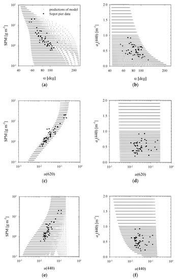 Diagrams illustrating possible values of main model input data describing the seawater composition (SPM and ag(440)) vs. quantities that may generally characterise the remote-sensing reflectance spectrum, i.e., the hue angle α (describing the colour seen by the human eye) (panel a,b), and u(620) and u(440) (describing the magnitude of Rrs in the red and blue parts of the spectrum) (panels from c–f). The figures also present the data from the Sopot pier.