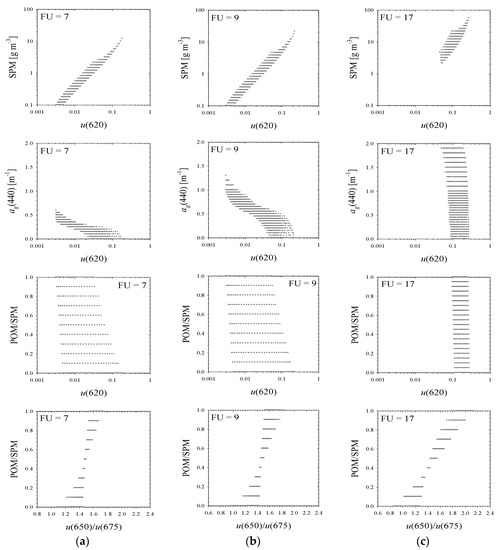 Sets of diagrams plotted for three Forel-Ule scale classes presenting relationships between quantities describing seawater composition (SPM, ag(440) and POM/SPM) and values of u(620) or ratio of u(650)/u(675); (a) For FU = 7; (b) For FU = 9; (c) For FU = 17.