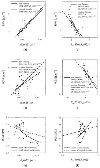 (a–d) Simple statistical formulas for calculating SPM and POM concentrations as functions of either Rrs(625) or Rrs(490)/Rrs(625); the original formulas were developed earlier, based on data from different regions of the Baltic Sea (combination of formulas taken from references [21,23]); similar but new versions of these formulas are fitted to the new dataset from the Sopot pier (the formulas are given in each panel); (e,f) Plots of curves representing calculated POM/SPM values using these formulas; all the formulas are given against the background of points representing the new dataset from the Sopot pier (measured levels of SPM and POM, and values of Rrs(λ) obtained with the Hydrolight model).