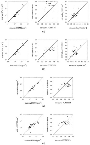 The accuracy with which these two algorithms match the individual measurements made in the nearshore environment of the Baltic Sea was assessed statistically. Note that this was merely a preliminary assessment of this accuracy, not a validation, which, of course, will need to be performed on an independent data set. Our initial assessment indicates that in some cases the accuracy of the new algorithms in relation to the estimation of quantities characterising suspended matter in water (SPM, POM and PIM) may be slightly better, and in other cases, slightly worse than the accuracy of simple, “locally” calibrated empirical formulas, i.e., those using only certain information carried by the Rrs spectrum. Nevertheless, we can put forward the following arguments in support of the potential of the new algorithms. Firstly, besides characterising suspended matter, they simultaneously estimate the proportion of CDOM in seawater. Secondly, the assumption adopted in the modelling, that the composition of suspended matter and its proportions relative to the presence of CDOM are not correlated in any way, at least allows one to expect that these algorithms may have a more universal application than simple statistical formulas with “locally” matched coefficients. Obviously, this statement will require confirmation based on an independent data set.