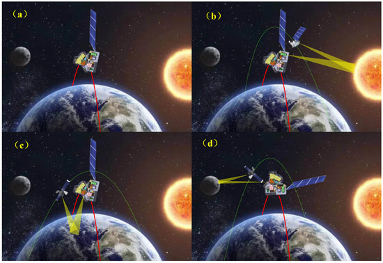 The working model of the radiometric benchmark satellite: (a) self-calibration, (b) total solar irradiance calibration, (c) uniform field calibration, and (d) lunar calibration.