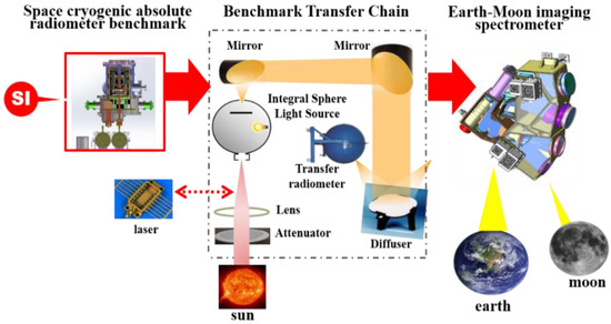 A Chinese expert group on earth observation and navigation with the 863 Project proposed the concept of a radiometric benchmark satellite in 2006 [33]. The Chinese Space-based Radiometric Benchmark (CSRB) project has been under development since 2014. The goal of the CSRB project is to launch the radiometric benchmark satellite, which adopts the new in-orbit calibration system, instead of using solar diffusers, standard lamps, vicarious calibration methods, and ground-based calibration techniques. The calibration principle of CSRB is similar to the Traceable Radiometry Underpinning Terrestrial-and Helio-Studies (TRUTHS) [34,35,36] as well as the Climate Absolute Radiance and Refractivity Observatory (CLARREO) [37,38,39]. The radiometric benchmark satellite has attained ultra-high precision tracing ability via self-calibration in orbit. The radiometric scale of the radiometric benchmark satellite is transferred to other satellites by synchronous observation of track crossing. The radiometric benchmark satellite will improve the long-term stability and the measurement accuracy of the emitted earth spectrum, the incident solar spectrum, and the reflected solar spectrum.
