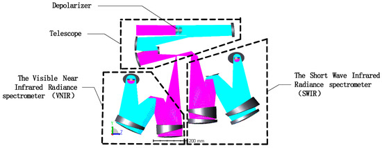 The EMIS is used to measure the radiance of the Earth and moon. The optical design of the EMIS consists of a telescope and a hyperspectral imaging spectrometer, as shown in Figure 3. The telescope adopts a four-mirror Anastigmat (4MA) design to eliminate aberration. The 4MA consists of four aspheric mirrors. The hyperspectral imaging spectrometer adopts an Offner structure. The prism is used as the dispersion element. The telescope uses the image space telecentric structure to achieve the matching conditions with the pupil of the spectrometer. The influence of stray light is reduced by setting baffles at the intermediate image plane. The EMIS makes a trade-off between the spectral and spatial resolution, with spectral and spatial sampling that are better than 10 nm and 100 m, respectively. The swath width is about 50 km at the nadir from a 600 km orbit. The EMIS adjusts the parameters of the lens, such as thickness and curvature. Then, the EMIS obtains a lower dispersion non-linear value and a better spectral performance is obtained.