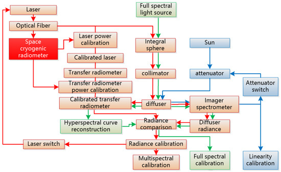 Calibration is important for the development of optical remote sensors. The quality of remote sensing data can be improved by calibration [21,22]. Remote sensors can be calibrated with high accuracy before being launched. The radiometric scale can be traced back to the cryogenic absolute radiometer. However, the traceability chain of pre-launched calibration is broken by the launching process, the space environment, and model drift. The optical remote sensor must be calibrated in-orbit. The in-orbit calibration mainly adopts the solar diffuse reflector, standard lamp, and standard blackbody at present. The Moderate Resolution Imaging Spectrometer (MODIS) is one key instruments for the Earth Observing System (EOS) of National Aeronautics and Space Administration (NASA). The EOS/MODIS uses a solar diffuser to realize the highest accuracy in-orbit calibration in the field of spectral imaging. However, the measurement accuracy is only 2% [23,24,25,26,27,28,29]. The on-satellite radiometric scale cannot be unified due to the random attenuation of the calibration system, such as the diffuser, the standard lamp, etc. The remote sensing data of different satellites are incomparable. Thus, remote sensors cannot satisfy the urgent needs of climate change research due to the low accuracy of in-orbit radiometric calibration [30,31,32].