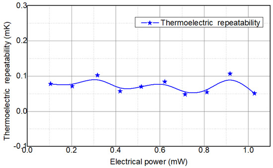 The three-stage heat transfer structure is designed for the connection between the blackbody cavity and the SPTC. The three-stage heat transfer structure consists of a main heat sink, a temperature-controlled heat sink, and a cryogenic platform. The two-stage precise temperature controller is designed based on the Proportional Integral Differential (PID) algorithm to establish a high stable thermal environment for the blackbody cavity. The temperature stability of the main heat sink was improved from 13 to 0.5 mK. The high stability of the working environment in the 20 K temperature region was thus established. The thermoelectric repeatability of the blackbody cavity was experimentally tested. The blackbody cavity was repeatedly heated by a group of electrical powers. The electrical power was increased gradually from 0.1 to 1 mW. The increase in electrical power was 0.1 mW. The temperature response curves were measured and the equilibrium temperatures were obtained as shown in Figure 6. The experimental results illustrated that the thermoelectric repeatability of the blackbody cavity is 0.1 mK with different electrical power inputs. The thermoelectric repeatability is optimized by the improvement in environmental stability.