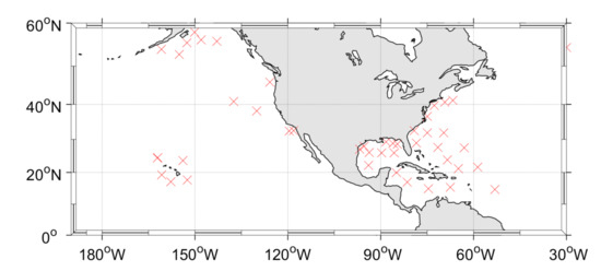 The locations of National Data Buoy Center (NDBC) buoys used in the paper.