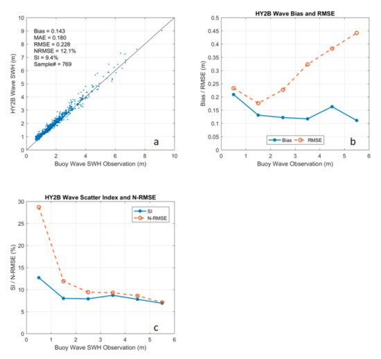 The validation of HY2B significant wave height (SWH) against NDBC buoys. (a) Indicates the scatters and the statistical parameters; (b) indicates the bias and RMSE distribution with the SWH value; (c) indicates the scatter index (SI) and normalized root mean square error (NRMSE) distribution with the SWH value.
