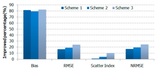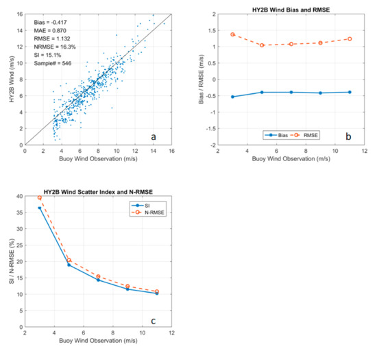 To evaluate the quality of HY2B data, statistical analysis based on the bias, mean absolute error (MAE), normalized root mean square error (NRMSE), root mean square error (RMSE), and scatter index (SI) is implemented. These statistical parameters are defined as follows: