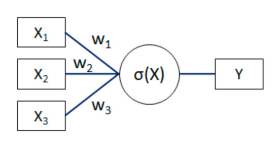 The basic calculation principle of one neuron. X1, X2, and X3 are the input of the neuron; W1, W2, and W3 are the weight of each input X; the activation function of the neuron is σ(X); Y is the output of the neuron.
