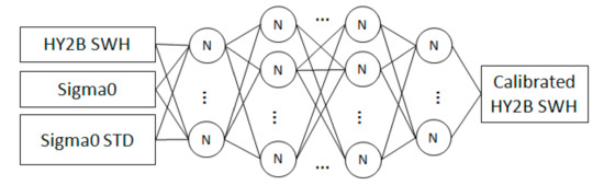 Known from Figure 2, the bias and RMSE change with the SWH. In this section, a deep neural network (DNN) is constructed to calibrate the HY2B original SWH with the SWH and other altimeter parameters as the inputs. The DNN is made up of a certain number of neurons working as follows: