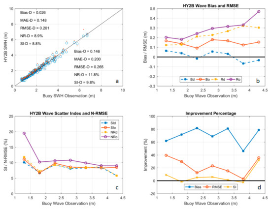 Detailed comparison between the DNN scheme 3 and original HY2B SWH. (a) Shows scatter plots of SWH from buoys and HY2B. Red dots and blue circles stand for original HY2B and DNN calibration, respectively; (b) shows the bias and RMSE variation with SWH, Bd, and Bo indicate the bias of DNN calibration and original HY2B, respectively, Rd and Ro represent the RMSE of DNN and original. While (c) shows the SI and NRMSE variation with SWH, SId and SIo stand for SI of DNN and original; NRd and NRo stand for NRMSE of DNN and original; (d) shows the percentage of improvement by the DNN calibration for bias, RMSE, and SI.