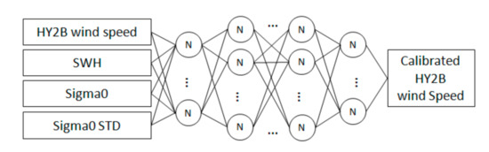 Having obtained the promising calibration result by using DNN in SWH, we performed another experiment of wind speed calibration based on DNN. The parameters of altimeter besides the HY2B original wind speed are used as the input of the DNN for calibration. It is pointed out that the wave SWH should also be included in the calculation of wind speed beside the sigma0 [29]. Therefore we include the HY2B wind speed, sigma0, SWH, and sigma0 STD into the DNN, which enables a good calibration by refining the information from these inputs. The structure diagram of the SWH calibration DNN is shown as Figure 8. The basic structure of wind DNN model is similar as SWH DNN, which is formed by five layers of neurons. The activation function is also the ReLU. The loss function used in training is MSE, the optimizer is adam.