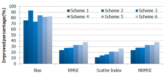 The training of DNN is performed according to these six schemes and allows to finally obtain their wind speed calibration results. The statistical results are show in Table 4 and the improvement percentage of each scheme is shown in Figure 9. Overall, the scheme with more input gets better calibration accuracy. Scheme 1 only has original wind speed as the input, and is more focused on bias reduction, meanwhile show a least decrease in the SI or NRMSE; when comparing the scheme 2, 3, 4, they all use two inputs that with sigma0, SWH and sigma0 STD, respectively. It can be seen that although adding another parameter can help to have better calibration, the addition of sigma0 STD gets the best improvement than SWH and sigma0 itself. When we add the sigma0 STD into DNN, the calibration can decrease 32.6% of RMSE and improve SI by 21%! It is reasonable because the wind speed of original HY2B altimeter is calculated by using the algorithm with sigma0 and SWH as the input, so the amount of new information provided by SWH and sigma0 is limited. Meanwhile, it should be noted that the parameter sigma0 STD should be considered as a key factor in wind speed calibration. Therefore it is not surprising to obtain the best calibration results for wind when using all four parameters as the input of DNN, as Scheme 6.