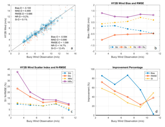 Detailed comparison between the DNN scheme 6 and original HY2B wind speed. (a) Shows the scatter plots of original HY2B wind speed (red dots) and DNN-calibrated wind speed (blue cycles); (b) shows the bias and RMSE distribution with the wind speed. Bd and Bo represent the bias of DNN calibration and original HY2B, respectively. Rd and Ro stand forRMSE of DNN and original; (c) shows the SI and NRMSE variation with wind speed, SId and SIo represent the SI of DNN and original while NRd and NRo represent the NRMSE of DNN and original. (d) shows the percentage of improvement by the DNN calibration for bias, RMSE and SI.