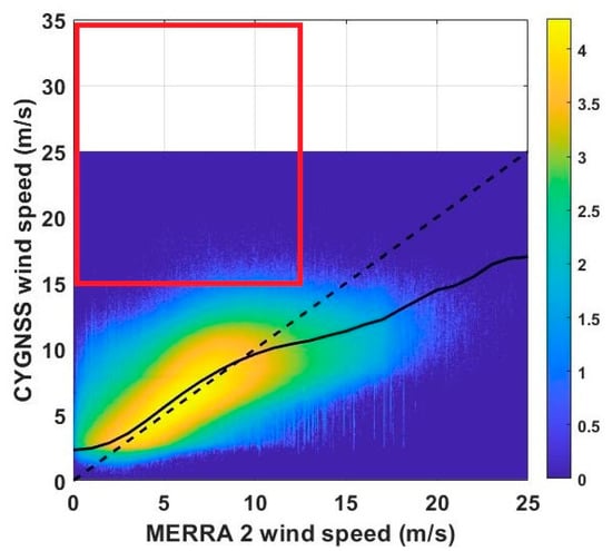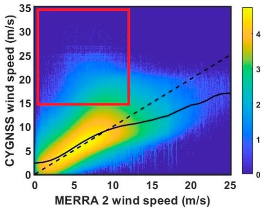 Log density plot of CYGNSS Level 2 retrieved winds matched to MERRA-2 reference winds for the wind speed range 0–25 m/s. The dashed line represents 1:1 agreement between the two winds. The solid line is the average CYGNSS retrieved wind at each MERRA-2 wind speed. A clustering of outliers can be seen near MERRA-2 wind speeds of 0-10 m/s and CYGNSS wind speeds >15 m/s (shown with a red box). One primary objective of the new filter is removal of this cluster.