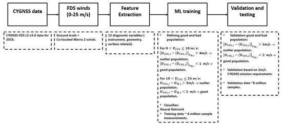 A block diagram representation of the quality control design process is shown in Figure 3. The first stage of the algorithm is feature extraction. The input to this stage is the Fully Developed Seas (FDS) winds over a reference wind speed region of 0–25 m/s. The CYGNSS Level 2 wind retrievals are of two kinds—the FDS and Young Seas Limited Fetch (YSLF) winds. The FDS winds are low to moderate winds (up to 25 m/s) over fully developed waves in the ocean. This forms the major proportion of the total measurements. The YSLF winds are hurricane force winds measured over the tropical cyclones that have varying wave age and fetch conditions. The filter proposed in this work is developed specifically for FDS winds as this dataset encompasses the majority of the measurements and have a well behaved nature relative to its counterpart. The feature extraction stage extracts the different diagnostic variables listed in Table 1 for every sample point. Next is the training stage. One Neural Network (NN) classifier is trained for each of the wind speed space over the individual training datasets described above. The last stage is the validation and testing stage where the skill of the filter is assessed. The performance assessment of this Neural Network filter is discussed in detail in Section 4.