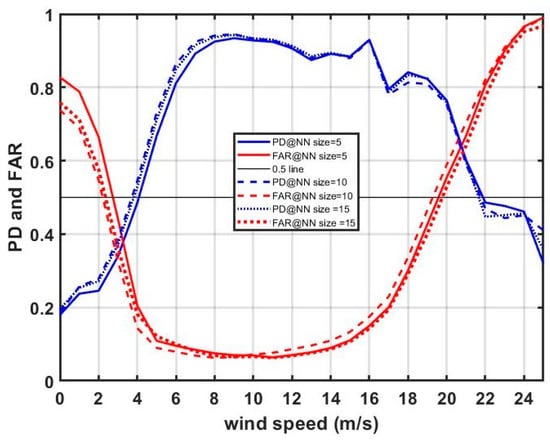 The blue curves represent PD and the red curves represent FAR. It can be noticed that all 3 network sizes have a very similar performance in terms of PD and FAR over the entire wind speed range. For this reason, other performance metrics such a computation time, network complexity and % samples removed as outliers are considered when choosing the optimal structure. In terms of computational time, NN size = 15 is the shortest, followed by NN size =10, and the longest is NN size = 5. This is an expected trend, as simpler networks can take larger time for error convergence. Next, in terms of network complexity, NN size = 5 has the least number of tunable parameters, followed by NN size=10 and the largest being NN size =15. The % of samples removed as outliers by NN size = 5 is ~ 23% of the total data, by NN size =10 is ~ 20% and by NN size = 15 is ~22%. Therefore, after all these considerations, NN size=10 is chosen as the optimal network design for this application.