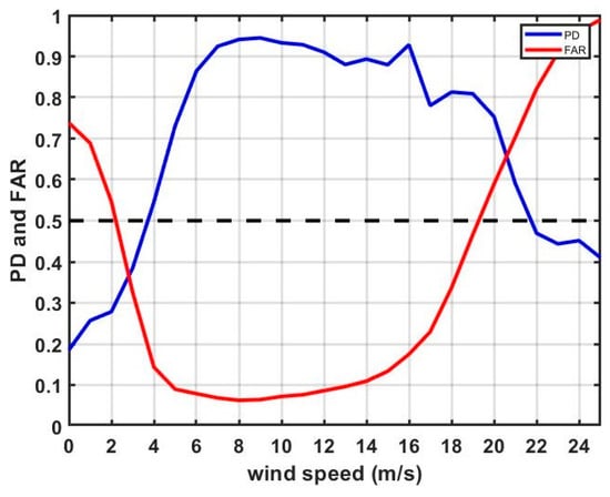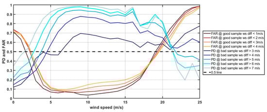 To evaluate the design space of this filter, the definitions of good and outlier samples are varied and the performance metrics are plotted. Understanding the behavior of the filter for different sample definitions can help users understand how the network handles the outliers and choose an optimum definition based on the application requirements. The family of PD and FAR curves are plotted in Figure 5. The blue curves represent PD and red curves represent FAR. The PD metric is affected by the density of outlier samples and the FAR metric is affected by the density of good samples. Changing the wind speed difference thresholds for good and outlier samples will affect the overall performance of this QC filter. For this study, the wind speed difference from the GMF line for a good sample is varied from 1 m/s to 4 m/s and for an outlier is varied from 3m/s to 7 m/s.