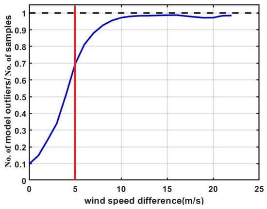 Next, the skill of the filter is assessed by looking at the ratio of number of outliers identified by the filter to the total number of outliers for a range of wind speed differences. This is shown in Figure 8. The x-axis is the difference between CYGNSS wind speed and the GMF line. As per our validation criteria, we have defined any sample as an outlier if the difference is greater than 5 m/s. The 5 m/s threshold is shown in red. It can be observed that ~70% of the outliers are rightly identified for wind speed difference ~ 5 m/s and the filter eliminates close to ~100% of outliers with wind differences >10 m/s.
