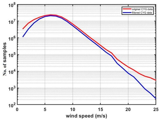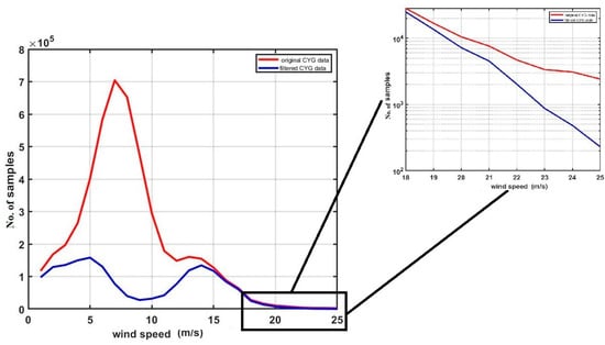 Finally, the total wind speed distribution of the dataset before and after applying the filter is plotted in Figure 10. After applying the filter, ~20.5% of the data have been removed by the filter as outliers. From Figure 10 it can be observed that the largest difference in density occurs at high wind speeds (>18 m/s). This is partly due to the high FAR of the filter in this region and partly due to large scatter in the data in this region. A substantial difference in density can also be observed at very low wind speed regions (<3m/s), again owing to the high FAR of the filter in this region.