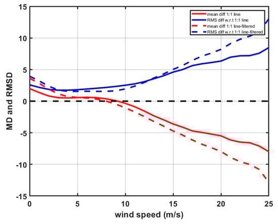 Comparing Figure 1 and Figure 6 demonstrates the effectiveness of the filter. The large cluster of high CYGNSS winds at low MERRA-2 winds has been removed by this filter (compare the red box region between the two figures). Also, the CYGNSS samples are now evenly distributed along the GMF line (solid black line) unlike in the original dataset. Finally, a significant reduction of scatter in the dataset can be observed. The performance of this proposed QC filter is assessed in the following subsections based on the error statistics Mean Difference (MD), Root Mean Squared Difference (RMSD) and variance of data. The test dataset consists of all the sample points (~153 million).