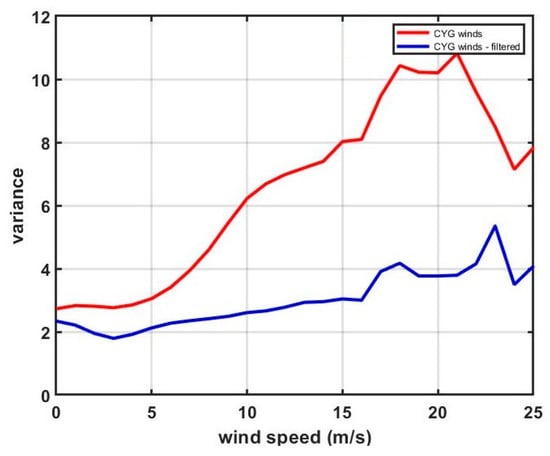 Variance in CYGNSS retrieved winds before and after QC filter.