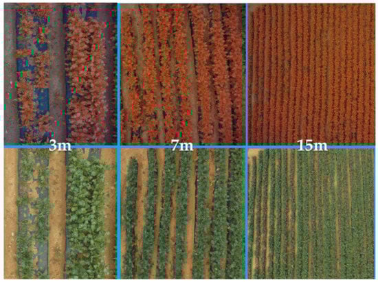 The dataset used in this research was collected by two photography drones (Phantom 4 Pro, DJI co., Ltd, Shenzhen, China.) on two agricultural areas in Jeju, Korea, between January 2018 and February 2018. The two fields have an area of 85 × 28 m2 and 76 × 35 m2, respectively. The distance between rows is 0.3 m. The drones’ maximum flight times were about 30 min, and the onboard camera sensors in the two drones had different Complementary Metal Oxide Semiconductor (CMOS) size, lens, and focal length. One drone was equipped with an RGB sensor with a stock 1/2.3 inch (1.10 cm) RGB CMOS camera sensor with 12.4 m effective pixels (DJI 2019). The other used a modified camera with Near Infrared, Red, Green (NRG) filter (520–575 nm (green), 600–670 nm (red), and 600–1030 nm (NIR)) to capture multispectral images (Store 2019). While low attitude enables small detail of a specific region (such as wilt versus healthy) to be captured, images captured in high attitude can cover a large area and allow inspectors to have a general view of the field. As a result, the drones were controlled to acquire the images at three different altitudes of approximately 3 m, 7 m, and 15 m above the ground level. Therefore, the dataset can be used later to serve different research purposes, as represented in Figure 1.