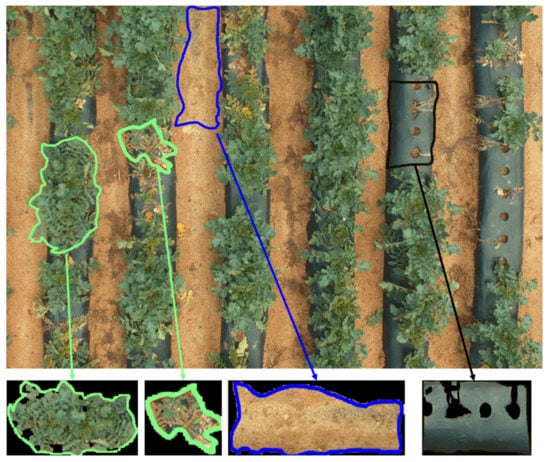 An RGB radish sample captured by UAV illustrates three distinctive types of objects (the green line shows radish regions, the blue line indicates soil, and the black line indicates plastic mulch).