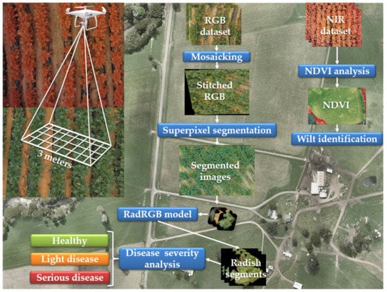 In analyzing different aspects of a typical plant disease detection system and reviewing previous works on radish wilt detection, it is imperative to implement an efficient radish early-stage wilt disease detection framework. Based on the obtained results, strengths and weaknesses of implementing radish wilt detection on RGB and NIR datasets are shown. For the RGB dataset, superpixel segmentation was applied to extract only radish regions from the radish field. After that, a customized convolutional neural network (CNN) model was trained to recognize the radish regions with the output contained only in the radish regions. The model is motivated by recent research on deep learning that demonstrated the potential to detect diseases in plants [,,]. Finally, we evaluated the severity of the wilt disease (healthy, disease heavy, and disease light) by applying various computer vision (CV) methods. With a more straightforward approach than the RGB complicated process, the NDVI value was calculated and analyzed to identify wilt disease in the radish field for the NIR dataset. Finally, the performance of the introduced framework was examined through various experiments.