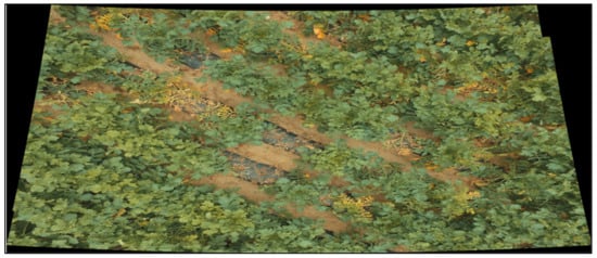 We picked 13 images at an altitude of 3 m to create the stitched RGB images. Upon extracting the features from input images, four nearest neighbors of each feature were included in feature spaces. After that, images that had over six matched images were identified and extracted from the feature matching step. As shown in Figure 5, the RGB stitched image has a size of 8404 × 3567.