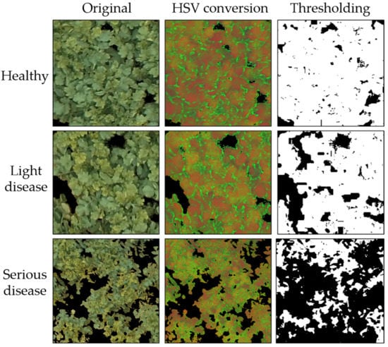 As a result, the mentioned characteristics were applied in the thresholding process to categorize each input image into healthy, light disease, or serious disease, as shown in Figure 8. When the  was over 90, which meant the white pixels occupied over 90% of the entire image, the image was classified as a healthy radish, because wilt pixels are insignificant when they take less than 10% of the whole field. If the percentage of white pixels was between 60% and 90%, the image was classified as the light disease region. Finally, the image was classified as a serious disease if the white portions occupied less than 60%.
