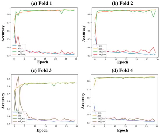 Four-fold cross-validation [] was then implemented on the training set, randomly dividing the dataset into four subsets. The model’s performance was examined four times, and three subsets were used as training data for each fold. The remaining subset was used for testing. After that, the three subsets used as training data were further separated into two subsets; 80% of training data was fed to the proposed model to optimize the network weights, and 20% of the data were utilized as a validation dataset to determine the optimized parameters.